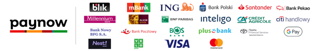 Podmiotem świadczącym obsługę płatności online jest mElements S.A. Dostępne formy płatności: Karty płatnicze: Visa, Visa Electron, Mastercard, MasterCard Electronic, Maestro.